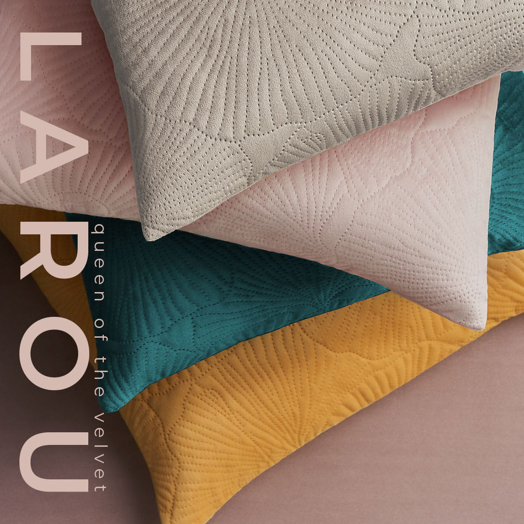 Zachwycająca, wytworna kolekcja poduszek Larou – aksamitny, przyjemny w dotyku welwet i kwiat Ginkgo w uroczym pikowaniu. Miękka tkanina subtelnie mieni się i tonuje nastrój. Doskonale odnajduje się w luźnym, niezobowiązującym wystroju jak i wyszukanej aranżacji.