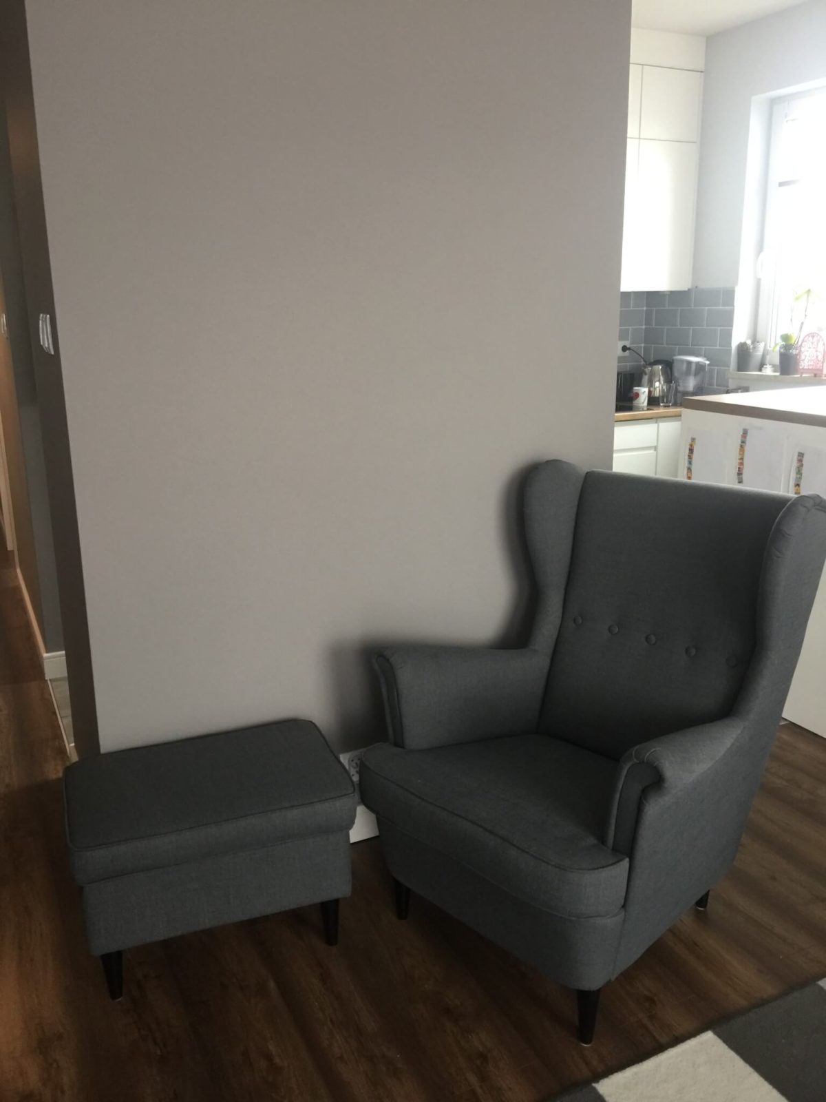 Uwielbiam takie fotele, a ten ma jeszcze podnóżek! Cudo!!! Całość wygląda bardzo fajnie, czerwony ładnie pasuje do szarego 🙂