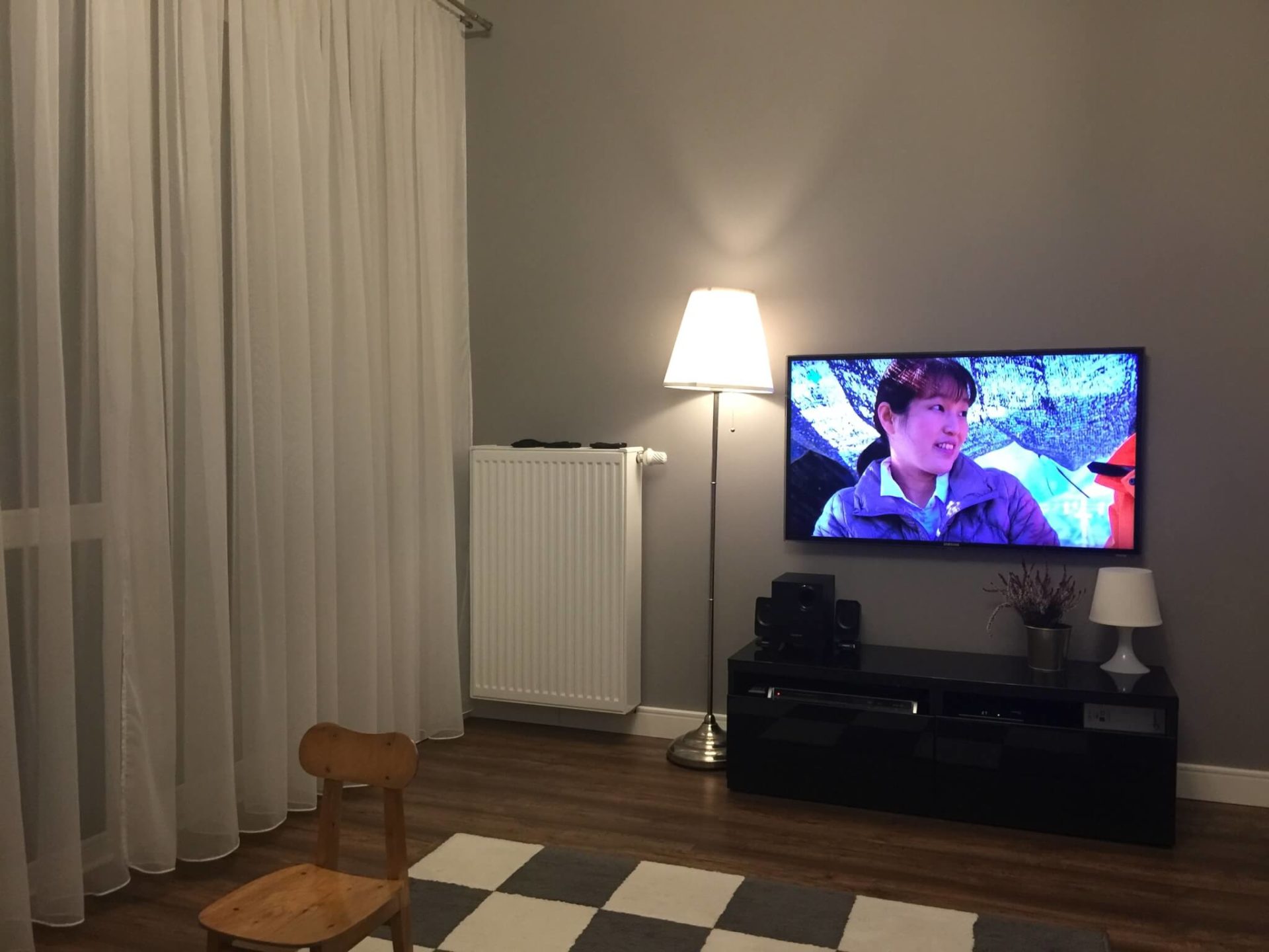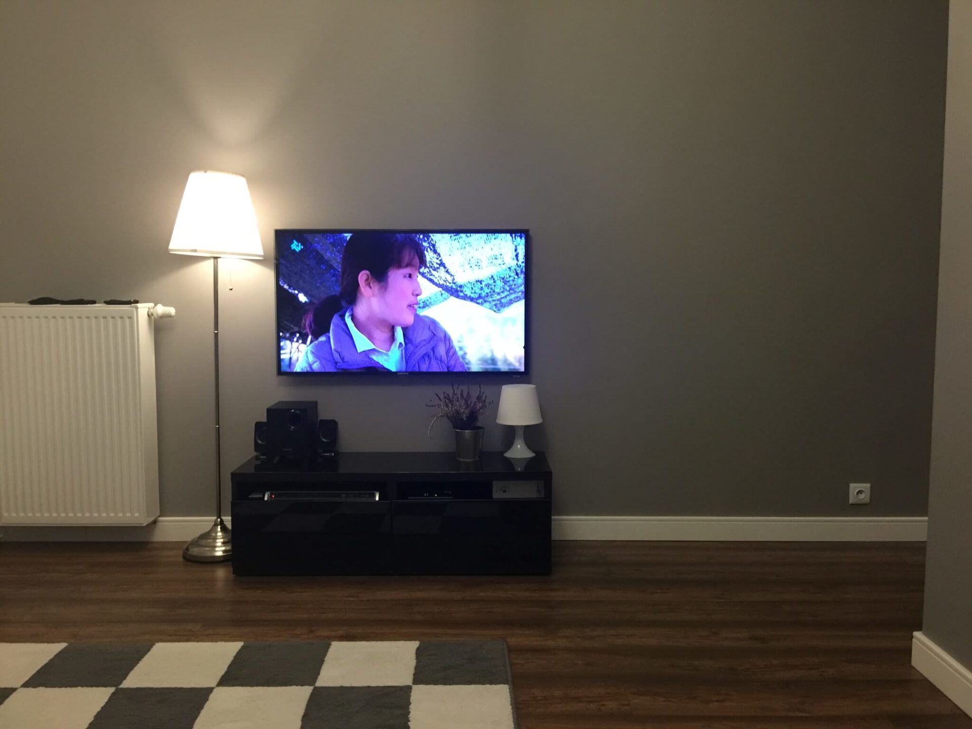Cały środek pomieszczenia, przykryty dywanem w szachownicę, jest pusty i niewykorzystany.